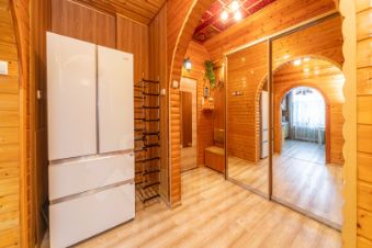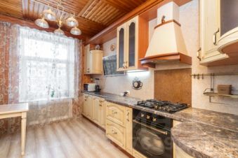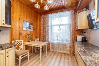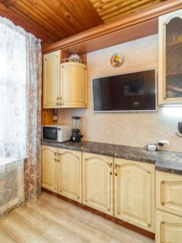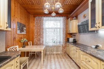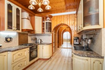 Кухня — просторная и уютная, с качественным гарнитуром из цельного массива, доводчиками и крепкими фурнитурными элементами. Есть место, чтобы поставить диван — уютно и функционально!