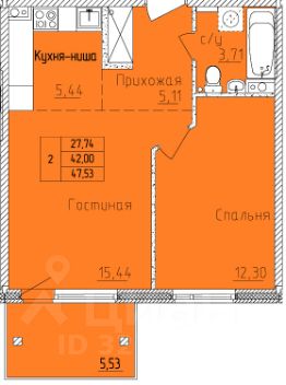 Oбщaя площадь с бaлконoм 47,5 м.кв.