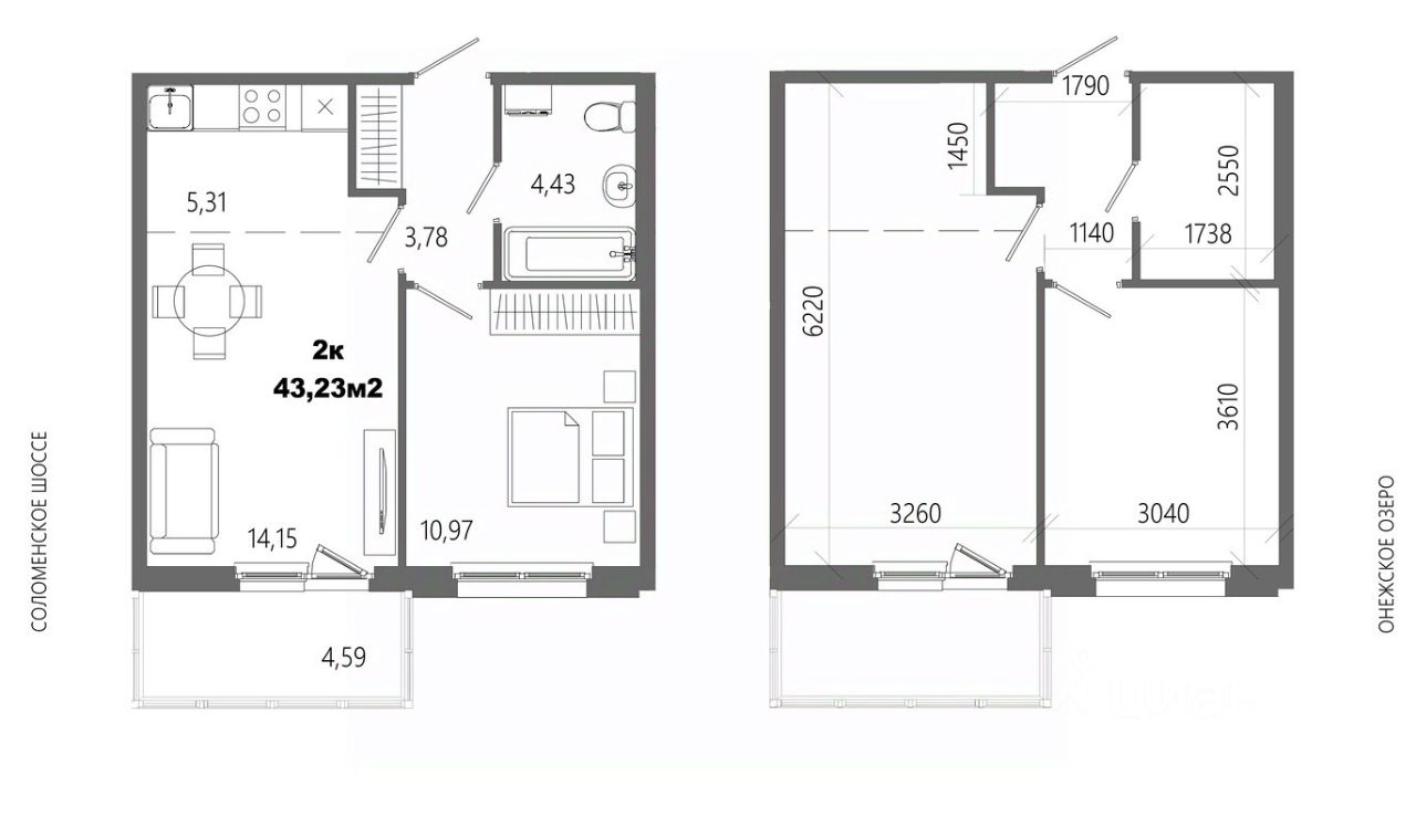 Продаётся 2-комнатная квартира в строящемся доме (Дом 8), срок сдачи: II-кв. 2028, общей площадью 43.23 кв.м., на 3 этаже.