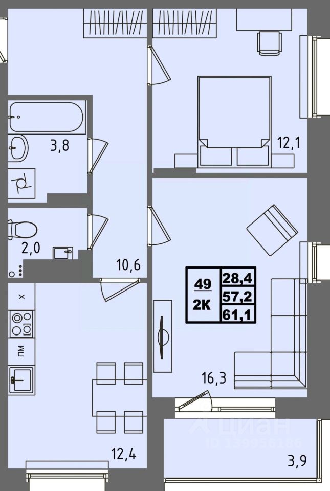 Общая площадь61,1 м²