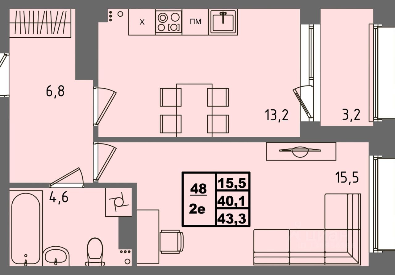 Общая площадь43,3 м²