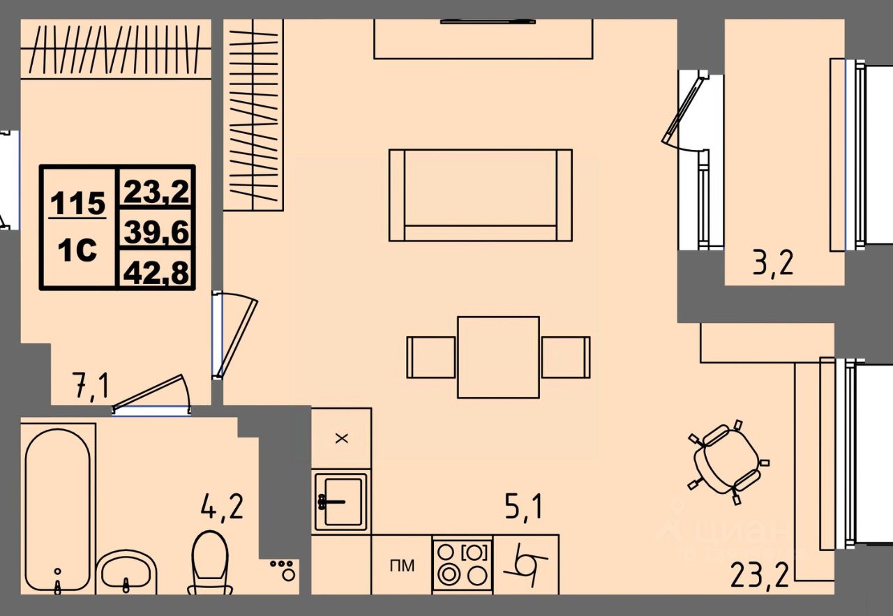 Общая площадь42,8 м²