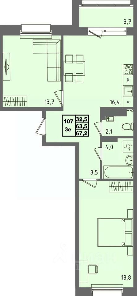 Общая площадь67,2 м²