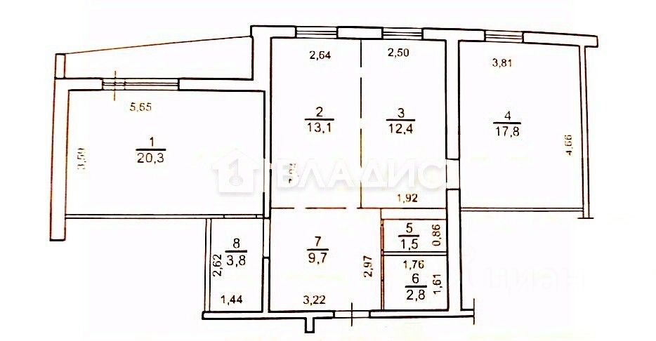 В квартире три комнаты площадью 20,3 кв. м, 13,1 кв. м и 12,4 кв. м, просторная кухня — 17,8 кв. м.
