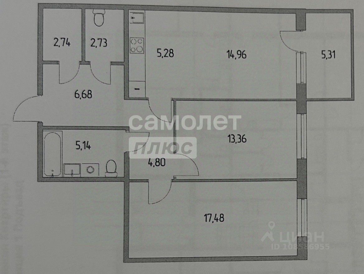 Продаётся уютная евротрёхкомнатная квартира 73,17 м² с балконом 5,31 м² в современном ЖК "Гармония".