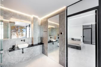 — Первый этаж: отапливаемый большой гараж на две машины, просторная гостиная с полностью укомплектованной кухонной зоной и панорамным остеклением, санузел, входная зона, тех.помещение (в котором установлены все системы жизнедеятельности дома, стиральная и сушильная машина Miele).