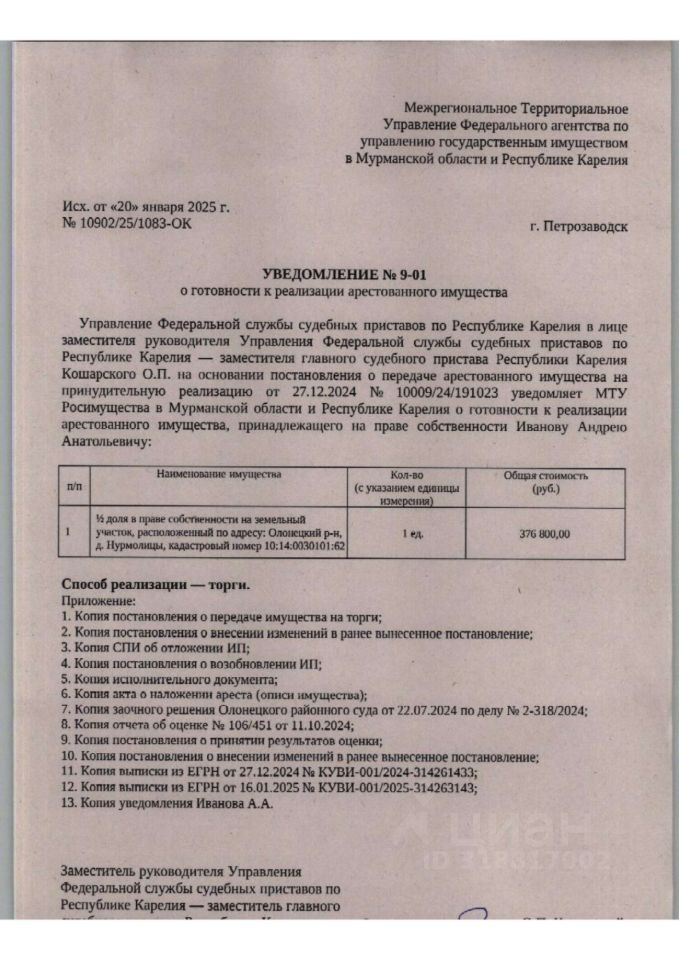 Лот 12. (Повторные торги). Земельный участок, расположенное по адресу: Республика Карелия, Олонецкий район, д. Нурмолицы, КН 10:14:0030101:62, площадью 1900 кв. м. .