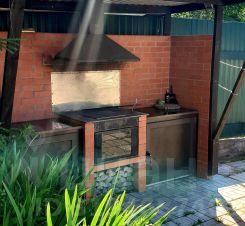 На заднем дворе организовано патио с мангальной зоной, установлен финский гриль.