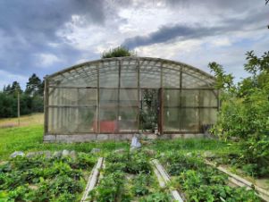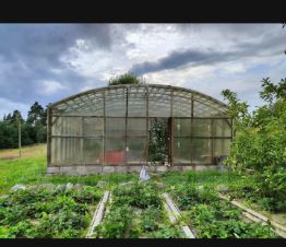У подножия леса, как в сказке, расположилась банька. Также на участке есть большая теплица на металлическом каркасе, два больших бетонных гаража и другие хоз. постройки.