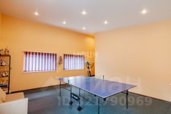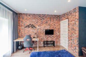 В семейном корпусе — гараж с автоматическими воротами, прихожая, кабинет и санузел. На втором этаже — спальня с большой гардеробной, санузел и спортивный зал с настольным теннисом и шведской стенкой. Просторная кухня-гостиная с финским камином объединяет семейную и гостевую части дома.