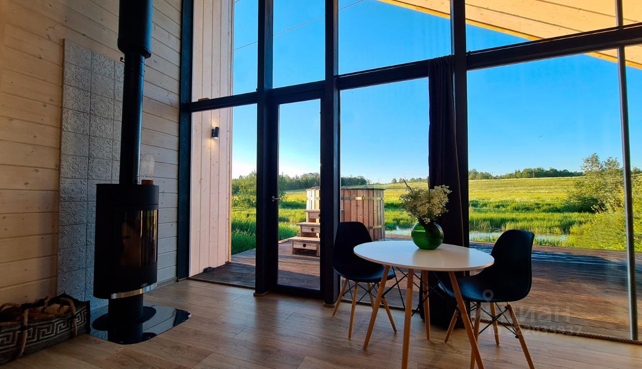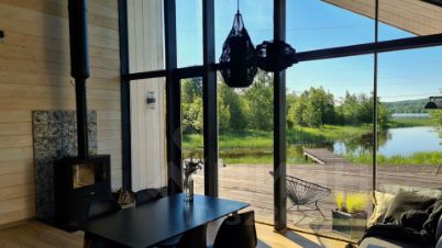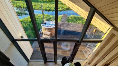 — Окна: качественные стеклопакеты иностранного производства. Благодаря панорамному остеклению, из каждого коттеджа открывается красивый вид на широкий ручей, поле или озеро.