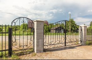 -Территория обнесена забором из металлического штакетника с кованными воротами и калитками