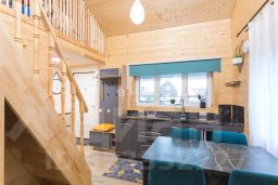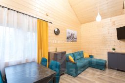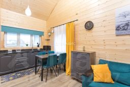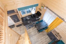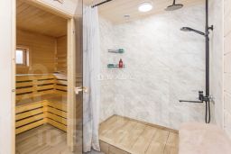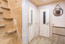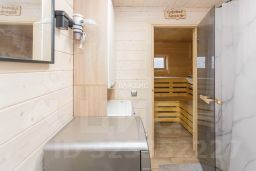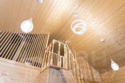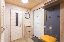 - На первом: веранда, прихожая, гостиная с камином, зона кухни, ванная комната, санузел, сауна
