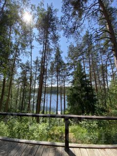 Участок для любителей звенящей тишины и первозданной природы. Вековые сосны на высокой скале. Перепад высот 10-15 метров. На самом верху стоит дом, с террасы которого открывается панорамный вид на озеро.