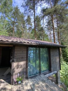 Планировка: кухня-гостиная, спальня, санузел, тамбур, крытая веранда с кирпичным мангалом, терраса с видом на озеро.
