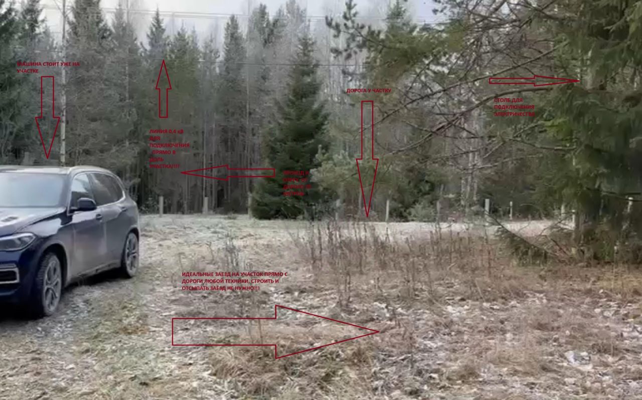 Заезд прямо с дороги, заедет без проблем любая строительная техника, дорога к участку чиститься зимой. Вдоль участка новая линия 0,4КВ (подключение электричества в течении месяца, по льготной цене). Участок правильной формы, сухой, ровный, без подтоплений и "интересного" рельефа, с красивейшими вековыми соснами и елями. Участок размежеван, установлены кадастровые вешки по границам.