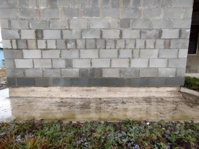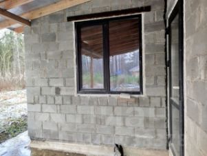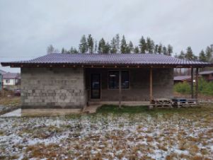 Дом построен на монолитной плите толщиной 300 мм, стены выполнены из бетонных блоков (толщина стен в два блока по 200 мм), крыша покрыта металлочерепицей. Утепление дома планируется термопанелями 100 мм с имитацией кирпичной кладки (закуплены на всю площадь дома) Установлены 2-х камерные стеклопакеты.