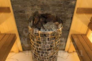 -Сауна отделка осиновой вагонкой и имитация кирпича в зоне печи-камина