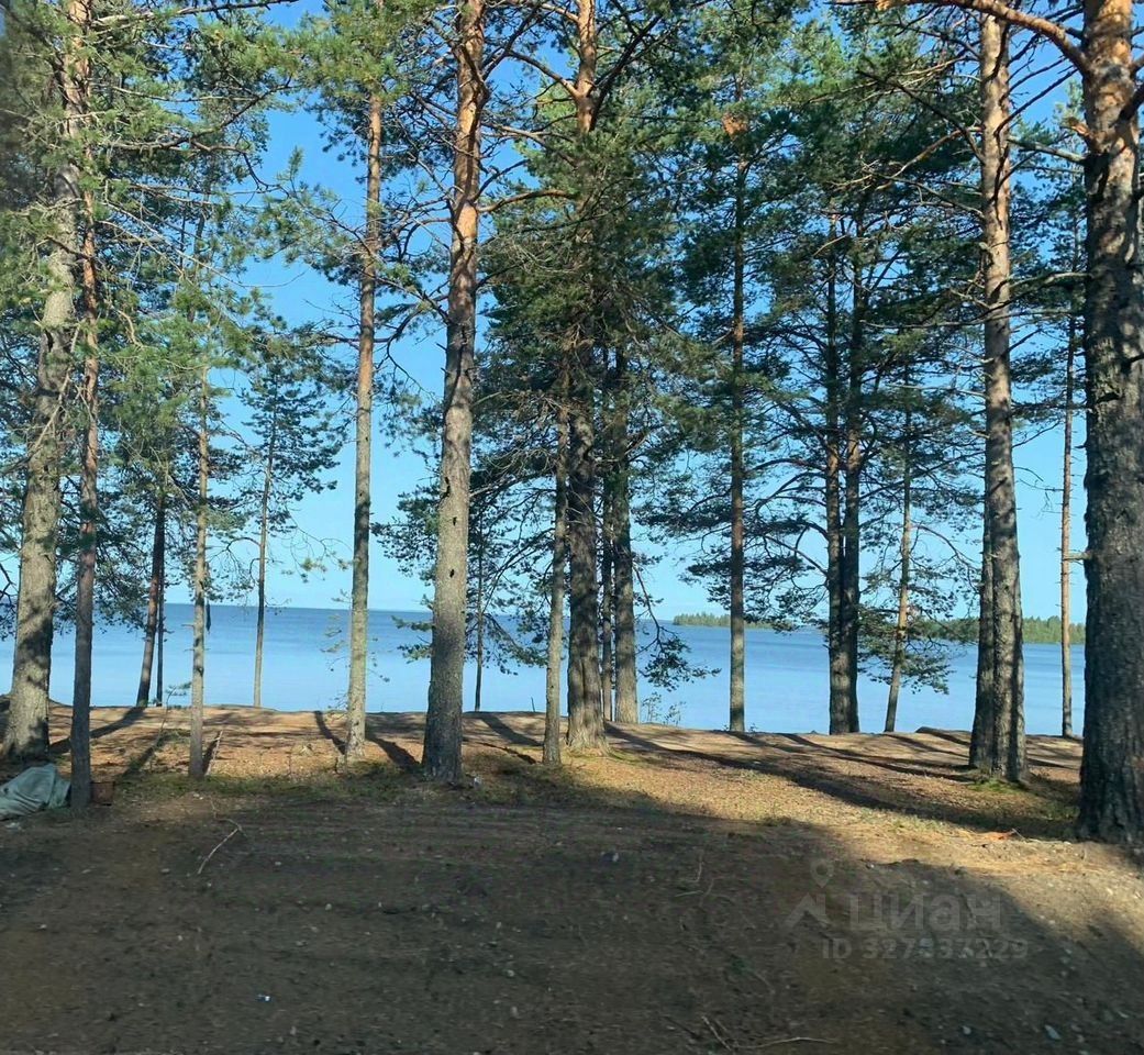 - Ровный, чистый участок на берегу Онежского озера, окруженный соснами.