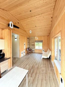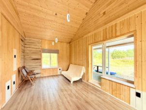 Комфортная и функциональная планировка: -просторная кухня-гостиная 28.2 м2 с панорамными окнами и видом на озеро, отдельным выходом на террасу, установлен напольный камин; -три отдельные спальни 11.2+11.2+10.8 м2, -совмещенный С/У, котельная и большая прихожая 7 м2. Комнаты правильной прямоугольной формы, с большими окнами, в доме много света и пространства. Есть чердак, высота в коньке 2.8 м.
