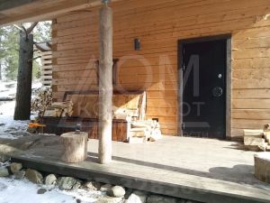 Баня 6*6 м. жилая, со всеми необходимыми коммуникациями на ленточном фундаменте, утепление пола пенопласт 200 мм, потолка 100 мм, материал стен брус 200*200 мм., два этажа, отделка лиственница, ясень + дровяник 4*3 м.