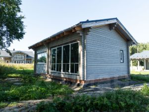 Коттедж покрыт маслом Biofa (Австрия): внешний цвет — морская галька (синий), внутренний — белый.