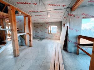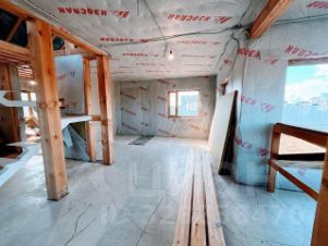 Первый этаж готов к отделке (имитация, гипсокартон и т.п), дополнительно на весь первый этаж (большого дома) имеется имитация бруса и ламинат с подложкой (это для спальни);