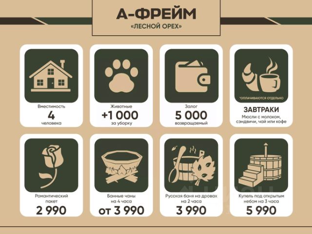 бесплатная парковка, видеонаблюдение, отдельный мангал, аренда квадроциклов, снегоходов, велосипедов, ватрушки, лодки, рыболовные снасти, баня, доставка еды и продуктов.