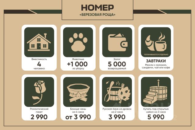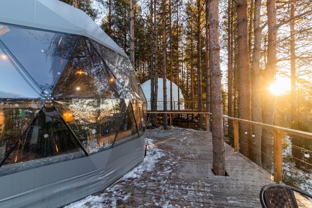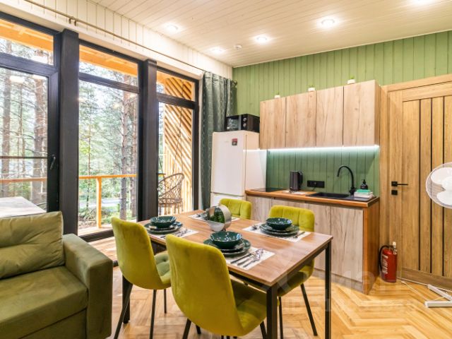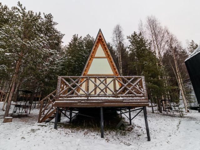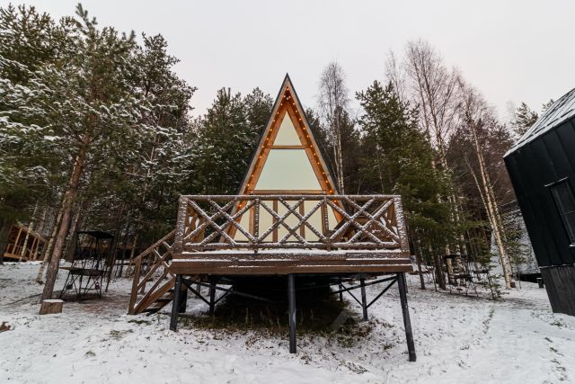 На базе 5 благоустроенных домиков круглогодичного проживания, с открытыми террасами, из которых растут сосны. Домик рассчитан на проживание 2 человек (есть возможность организовать дополнительное спальное место в формате эргономичной раскладушки с матрасом и постельным бельём). Домик оборудован мини-кухней (СВЧ-печь, чайник холодильник, посуда), спальные места это подиум с двумя раздельными эргономичными матрасами, удобными подушками и теплыми одеялами.