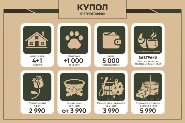бесплатная парковка, видеонаблюдение, отдельный мангал, аренда квадроциклов, снегоходов, велосипедов, ватрушки, лодки, рыболовные снасти, баня, доставка еды и продуктов.