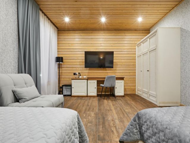Для вашего удобства у нас есть небольшая гостиница с 12 номерами, выполненными в элегантном стиле старой Европы, площадью от 24 до 34 м². Также к вашим услугам просторные коттеджи для семей от 2 до 10 человек и дома в английском стиле, идеально подходящие для больших компаний (до 12 человек). В каждом номере вас ждут: телевизор Smart TV (55 дюймов), мини-холодильник, чайник, столовые приборы, мягкие полотенца, тапочки и все необходимые туалетные принадлежности.
