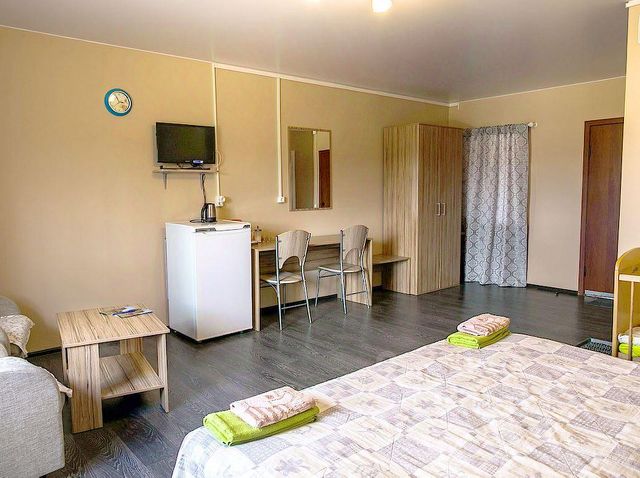 База отдыха в поселке Мийнала на берегу озера Киуккосенлампи. Национальный парк "Ладожские шхеры" расположен в 5 км. Ближайшая железнодорожная станция Хуухканмяки находится в 23 км. Для бронирования доступны 6 деревянных коттеджей и номера категорий Стандарт, Улучшенный и Люкс. В номерах есть удобная кровать, телевизор со спутниковыми кналами, холодильник, чайник, шкаф, ванная комната с феном и полотенцами. В отдельных коттеджах оборудована кухня с бытовой техникой, имеется зона отдыха, собственная ванная комната, спальни с двуспальными или раздельными кроватями. На территории базы отдыха есть кафе домашней кухни. Гости могут поиграть в бильярд, настольный теннис, заказать баню, взять в аренду лодки, велосипеды, катамараны, рыболовный инвентарь. Для детей имеется детская площадка и детская комната. Для гостей оборудована парковка. Номер расположен на втором этаже. В номере есть двуспальная кровать и дополнительное место на раскладном кресле. Номер оборудован душевой кабиной, предоставляется фен.