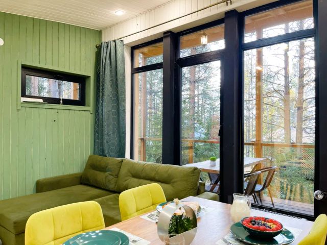 Домик для круглогодичного проживания с террасой и большой 2х спальной кроватью. Рассчитан на 2х человек, +1 человек (за доп. оплату предоставляем эргономичную раскладушку с матрасом и комплектом постельного белья. Домик с панорамным окном (с ролетной шторкой) и видом на озеро. Что в домике? - Большой 2х спальный матрас на подиуме в комплекте раздельные подушки и одеяла+белые полотенца(большое и малое, коврик для ног); - Мебель: вместительный комод для вещей/стулья/кухонный уголок с минимальным набором посуды; - Техника: СВЧ печь/Чайник/Холодильник/Эл. обогреватель/Фен; - Удобства в номере: Туалет/Душ+бойлер 50л/Мойка/Пол с эл. подогревом Зона барбекю: мангал, решетка, шампура и комплект уличной мебели на террасу.