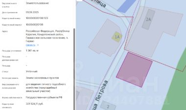 Право заключения договора аренды земельного участка из земель населенных пунктов, имеющего кадастровый номер 10:03:0020108:123, площадью 1361 кв.м, местоположение: Российская Федерация, Республика Карелия, Кондопожский район, Ги...